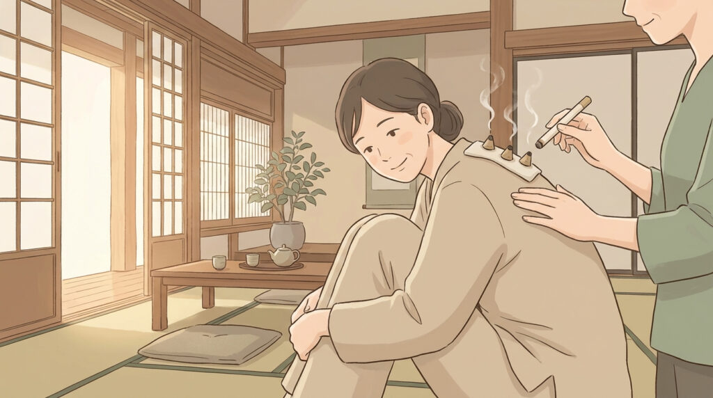 「寒気がする」「首がこわばる」という方に軽い温灸をすると、ふっと表情がやわらぐことがあります。